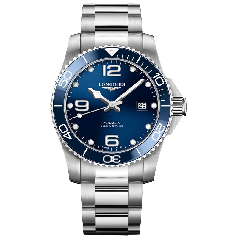 此款手表是LONGINES的潜水系列,特别为对海洋充满热情的男士所打造,明快犀利,无论是休闲装扮还是探寻水底世界都足够吸引你。防水功能达至相等于300米的水压,装配单向旋转表圈,旋入式表壳和表冠,双重保险折叠式表扣。自动机械机芯,天蓝色面板镶嵌阿位伯数字和时标,辨识清晰快速,夜光表针,十分动感且提升夜间可视度。表径39mm,厚11.85mm,防水深度300米。