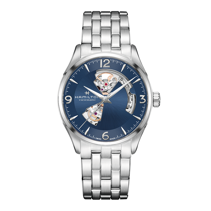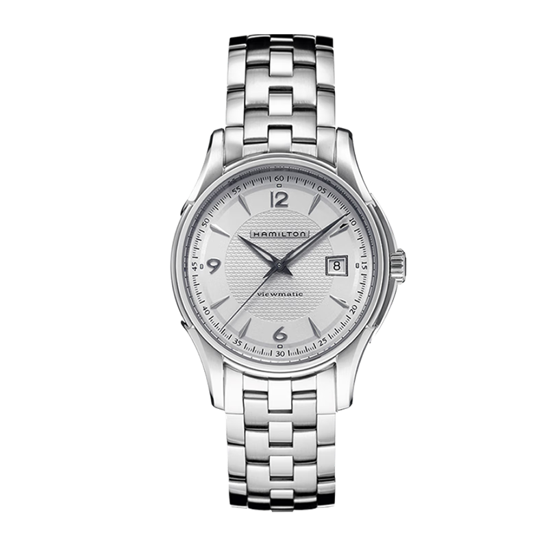 HAMILTON汉密尔顿 爵士大师系列 男士自动机械手表,货号H38615155,银色不锈钢表壳表链,简洁大气。银色表盘搭配银色指针刻度,6点钟方向有日期显示。内置一颗21石的ETA 2892机械机芯,具有42小时的动力储存。蓝宝石表镜耐摩擦。表盘直径为43mm,厚度8mm,50米的日常防水功能。
