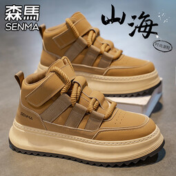 森馬高帮男鞋冬季2025新款百搭真皮加绒板鞋男士软底增高休闲保暖棉鞋 卡其色 39