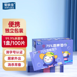 爱肤佳(aifujia)75%酒精湿巾独立包装家庭实惠学生儿童消毒杀菌湿纸巾 【独立包装】100片*1盒