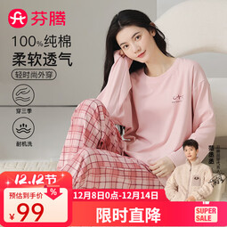芬腾睡衣女【100%纯棉】2025秋冬新款格纹可外穿长袖家居服套装女睡衣 粉色 M