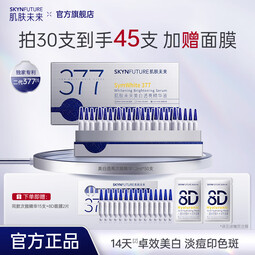 这款肌肤未来377美白透亮次抛精华祛斑淡印提亮精华液专为学生设计。独特配方有效淡化色斑、减轻暗沉,让肌肤更明亮透亮。先进美白技术快速渗透皮肤底层,深层修复和美白效果显著。含多种植物提取成分滋养肌肤、改善细纹,具有抗氧化功效延缓衰老过程。建议购买30支装套装享受价格优惠并赠送15支。每天早晚洁面后均匀涂抹于面部按摩至吸收即可。持续使用看到更好效果。无论您是追求美白或改善暗沉问题,这款精华液都能带来理...