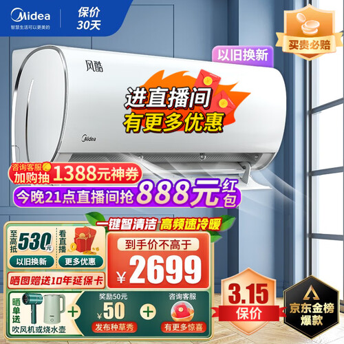 Midea 美的 风酷 KFR-35GW/N8XHC1 壁挂式空调 1.5匹,配备第二代导风板,送风范围更广,防直吹效果更好,支持上下左右摆风。基于智能PI控制器和高精度观测算法,压缩机快速高频启动,急速制冷热,一键开启“智控温”模式,先快速降温后,自动回温至体感舒适温度。显示屏智能光感,第四代自清洁,支持APP控制,0.5℃调节,无极风速。能效比5.27,新一级能效,循环风量630m3/h