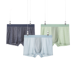 猫人男士内裤3条装,采用优质冰丝面料,柔滑细腻、轻薄透气,有效排汗保持干爽。大网眼设计增强空气流通,提升凉感;抗菌裆部处理抑制细菌滋生,呵护私密健康。三色组合(深灰、天蓝、浅绿)时尚百搭,满足日常需求。四角短裤头版型贴合人体曲线,不紧绷不束缚,自由活动无压力。L码适合体重80-100斤男性穿着。商品优势在于冰丝材质带来极佳透气性和亲肤感,大网眼结构促进空气循环,同时抗菌功能保障卫生安全,多色搭配方...