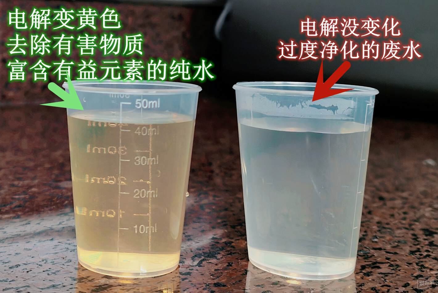 而经过电解后什么颜色变化都没有,仍然保持纯透明色的水,这种净水器如果你买到,可以马上退货了,因为这种水就是我前面提及的没包含任何元素的废水,长期饮用会让身体缺少营养,导制身体虚弱等问题。