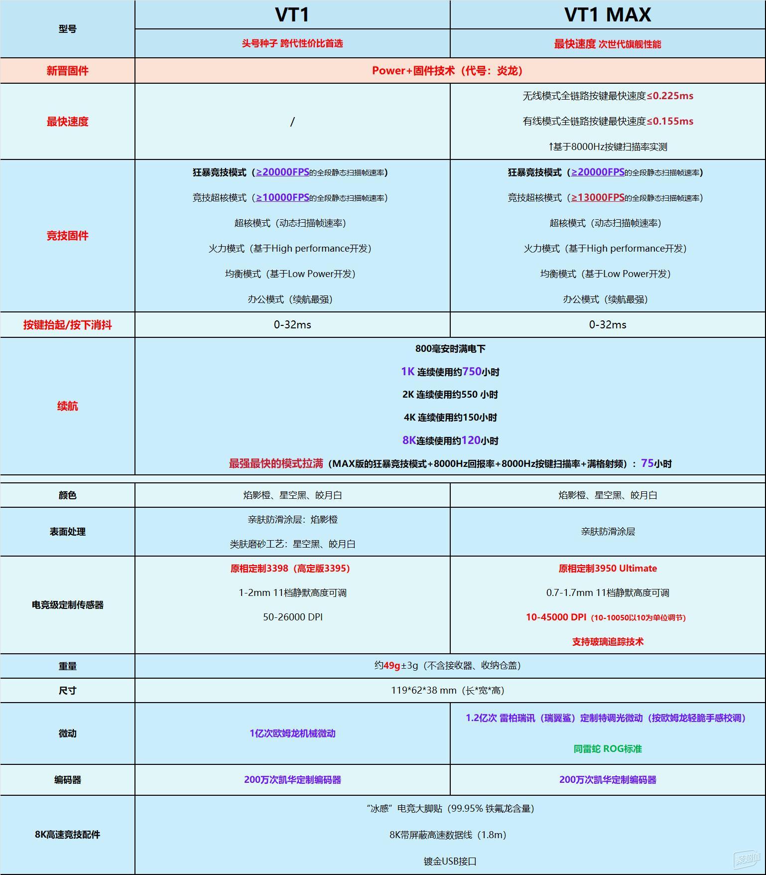 可以看到,两者的区别主要在于传感器的区别,VT1标准版搭载原相定制3398传感器(3395高定版),而VT1 MAX则配备更高级的3950 Ultimate传感器。