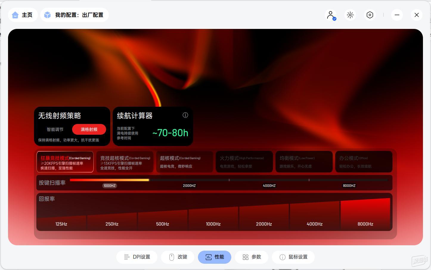 其驱动界面简洁直观,支持多种性能模式切换:如狂暴竞技模式(MAX和标准版均支持≥20000FPS)、竞技超核模式(标准版≥10000FPS,MAX版≥13000FPS)、超核模式、火力模式、均衡模式、办公模式等多种实用的场景模式。并且配置文件可以跟随应用切换,这功能非常实用,比如我设置FPS游戏时自动切换为狂暴竞技模式,日常办公则切换为办公模式,系统会根据前台应用自动切换配置,无需手动调整。这就是人性化的专业。