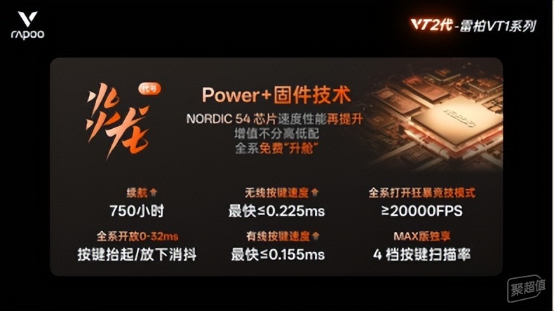 最近雷柏为其推出的全球首发Nordic 54系列芯片的VT1二代无线电竞鼠标推出了Power+(代号:炎龙)的固件技术,不分高低配,标准版、MAX版均可通过OTA增值。
