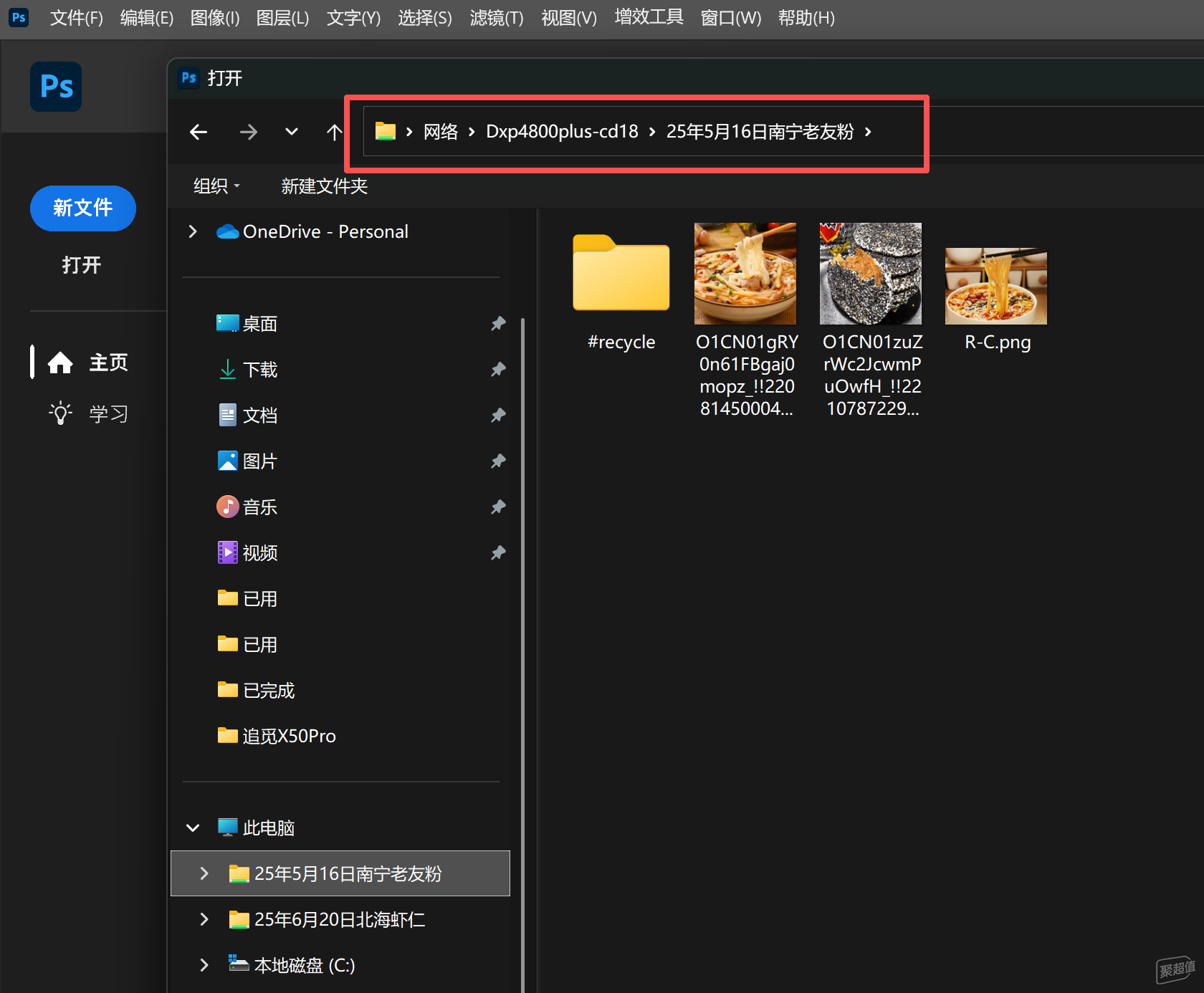 SMB协议也支持电脑的PS/LR/达芬奇等软件调用里面的照片与视频,跟本地硬盘差不多,非常方便,上图是PS打开SMB连接下绿联NAS上的文件。