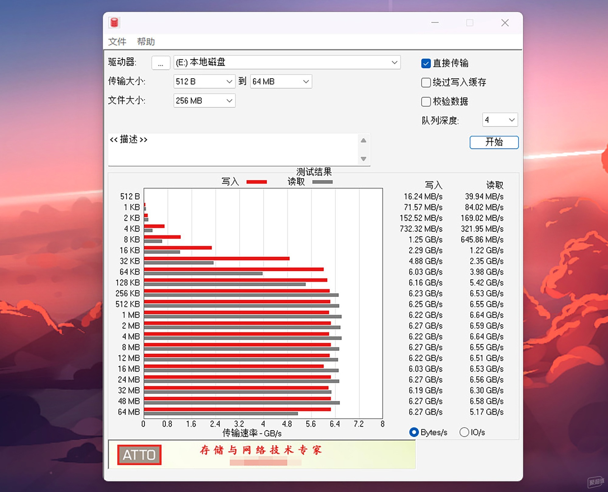 ATTO Disk Benchmark基准性能测试软件,测试结果如下图,闪迪WD Blue SN5100固态硬盘面对4K大小文件时的读写速度分别为321MB/s与732 MB/s,当文件大小在64KB以上基本达到满速写入,最大读取写入速度分别为6.64GB/s与6.27GB/s。