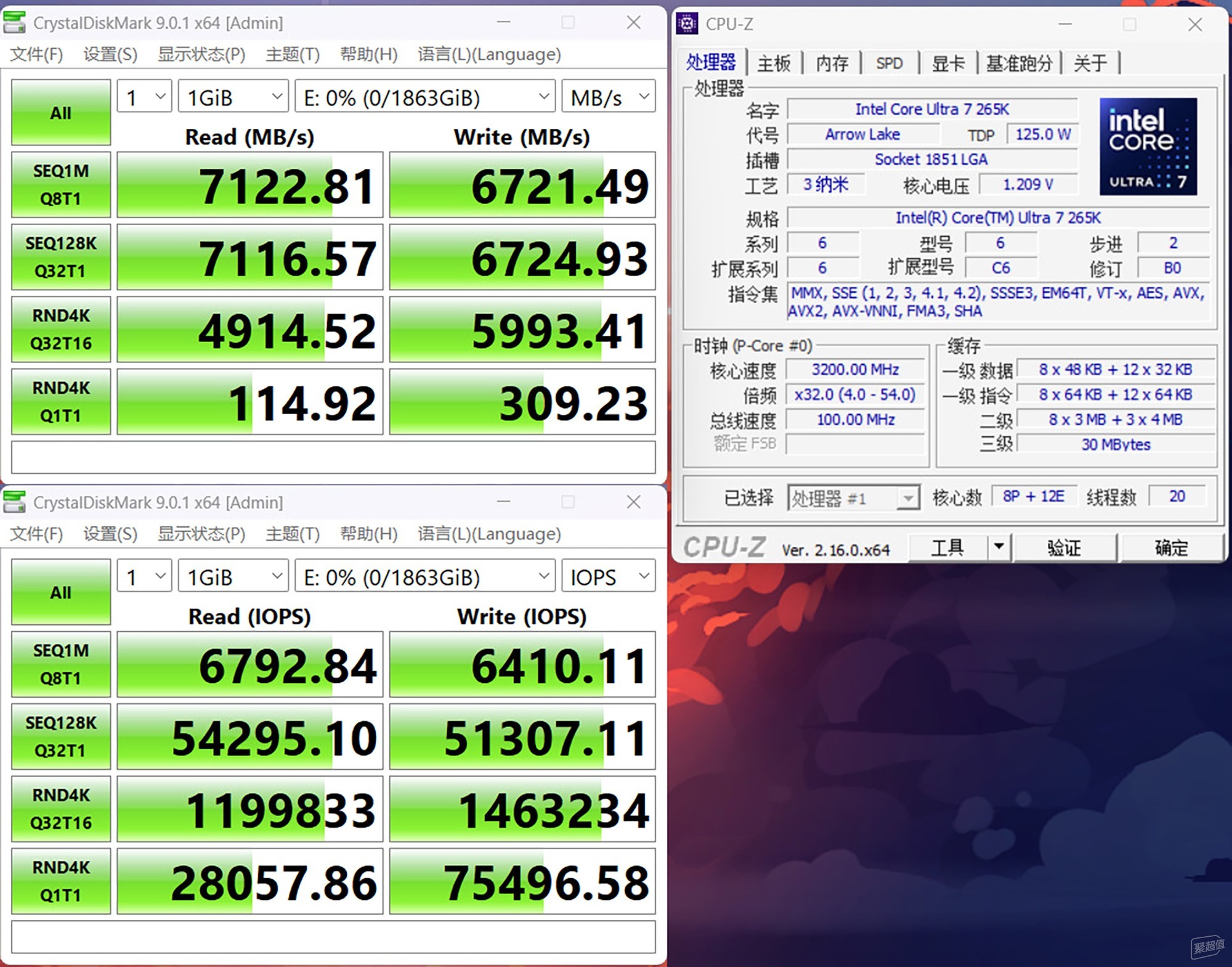 在英特尔酷睿Ultra 7 265K处理器硬件平台测试,在Crystal Disk Mark基准读写测试中,闪迪WD Blue SN5100固态硬盘的顺序读取写入速度分别为7122MB/s与6721MB/s,4K单线程读写速度分别为114.92MB/s与309.23MB/s,4K随机读写IOPS分别为1199K与1463K。