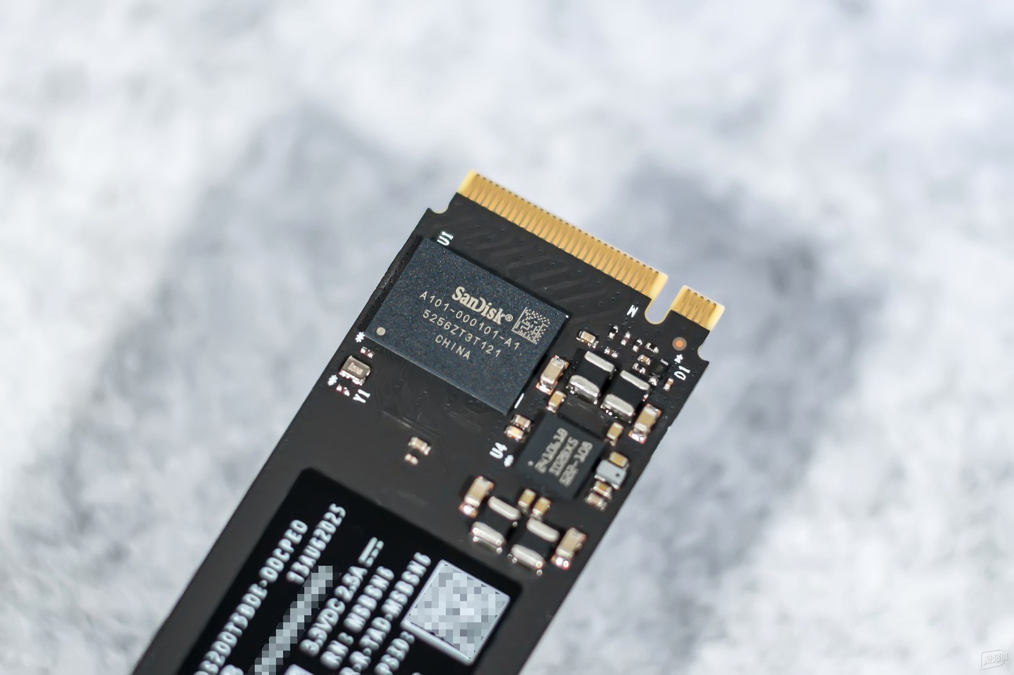 主控芯片与闪存颗粒分别位于标签贴纸的两侧,闪迪WD Blue SN5100固态硬盘采用无独立缓存DRAM-less架构设计,其搭载闪迪自研主控芯片,型号丝印为A101-000103-A1,支持HMB技术和智能SLC缓存技术,支持NVMe 2.0标准协议和PCIe4.0×4传输接口,右下方为电源管理芯片。
