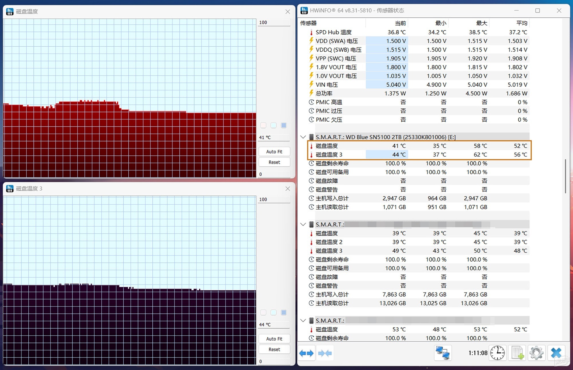 最后测试固态硬盘的发热表现,闪迪WD Blue SN5100 2TB固态硬盘提供了两个温度传感器数据,分别代表着主控芯片与闪存颗粒的温度,测试时室温为28℃并搭配主板的金属散热模块,利用软件记录全盘写入测试期间的温度数据,显示主控芯片与闪存颗粒的最高温度分别为58℃与62℃。
