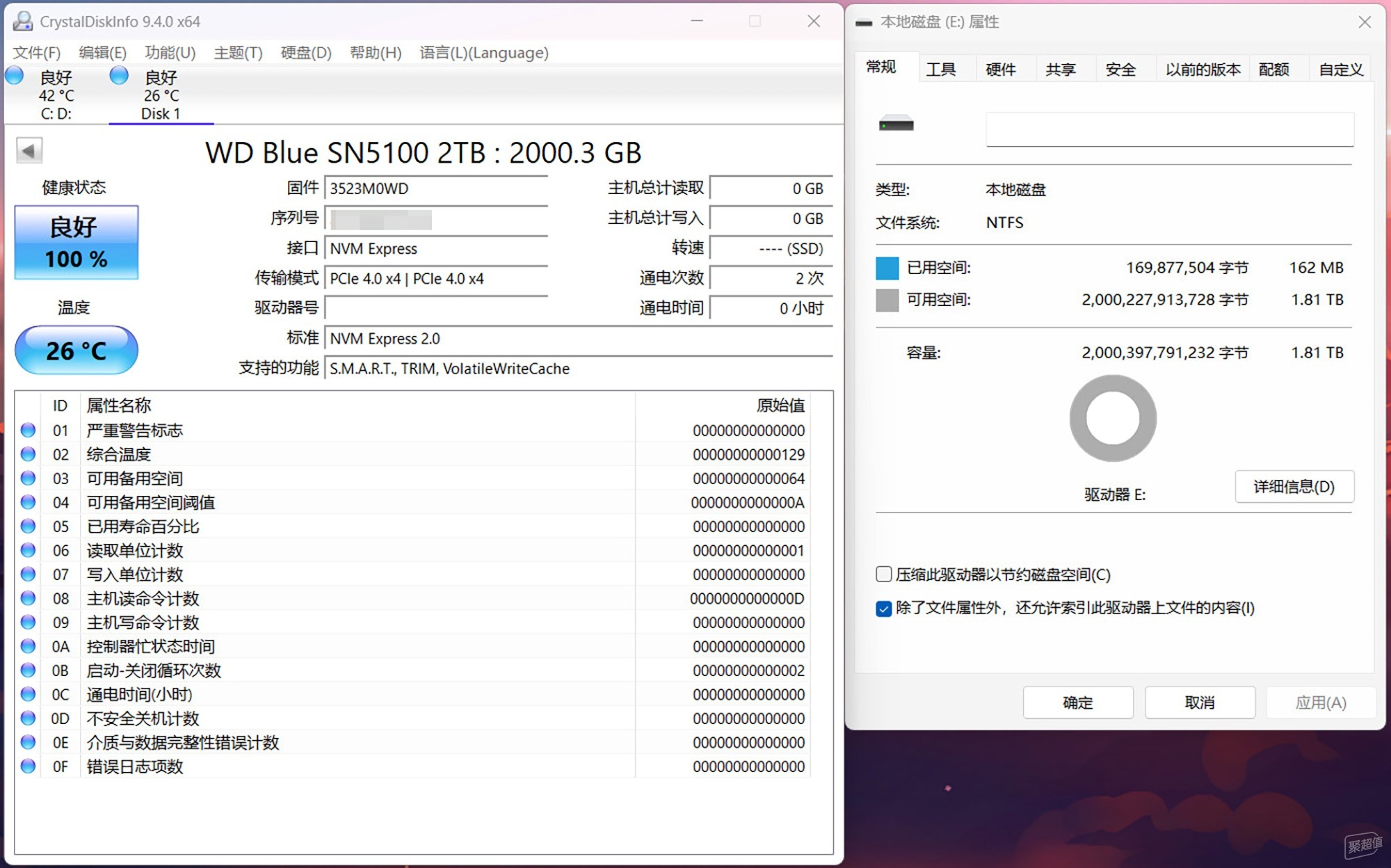 先使用CrystalDiskInfo软件去查看固态硬盘的运行状态,当前处于PCIe4.0×4传输模式,支持NVMe 2.0标准,以及SMART、TRIM,以及VolatileWriteCache等技术,由于搭配主板自带铝合金散热模块辅助散热,待机温度仅为26℃左右,格式化后用户实际可用容量为1.81TB。