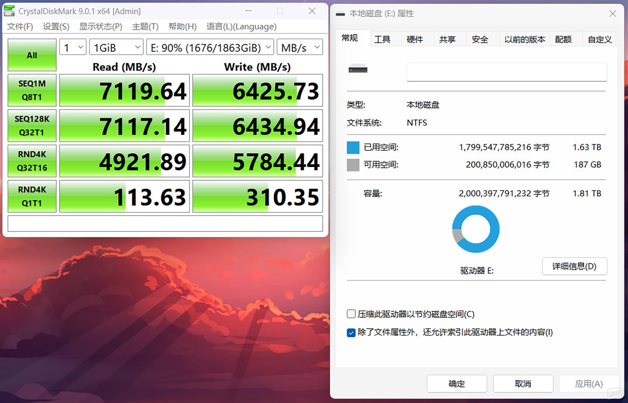 前面是基于空盘状态下的性能测试,与厂商标称的读写速度值相匹配,在实际当中固态硬盘中存储软件游戏与视频等大量数据,接着利用游戏文件数据将固态硬盘存储空间填充至90%,继续观察其读写性能表现,在90%占用率下的读写速度分别为7119MB/s与6425MB/s,对比空盘状态写入速度下降了一点点,读取速度则相差无几。