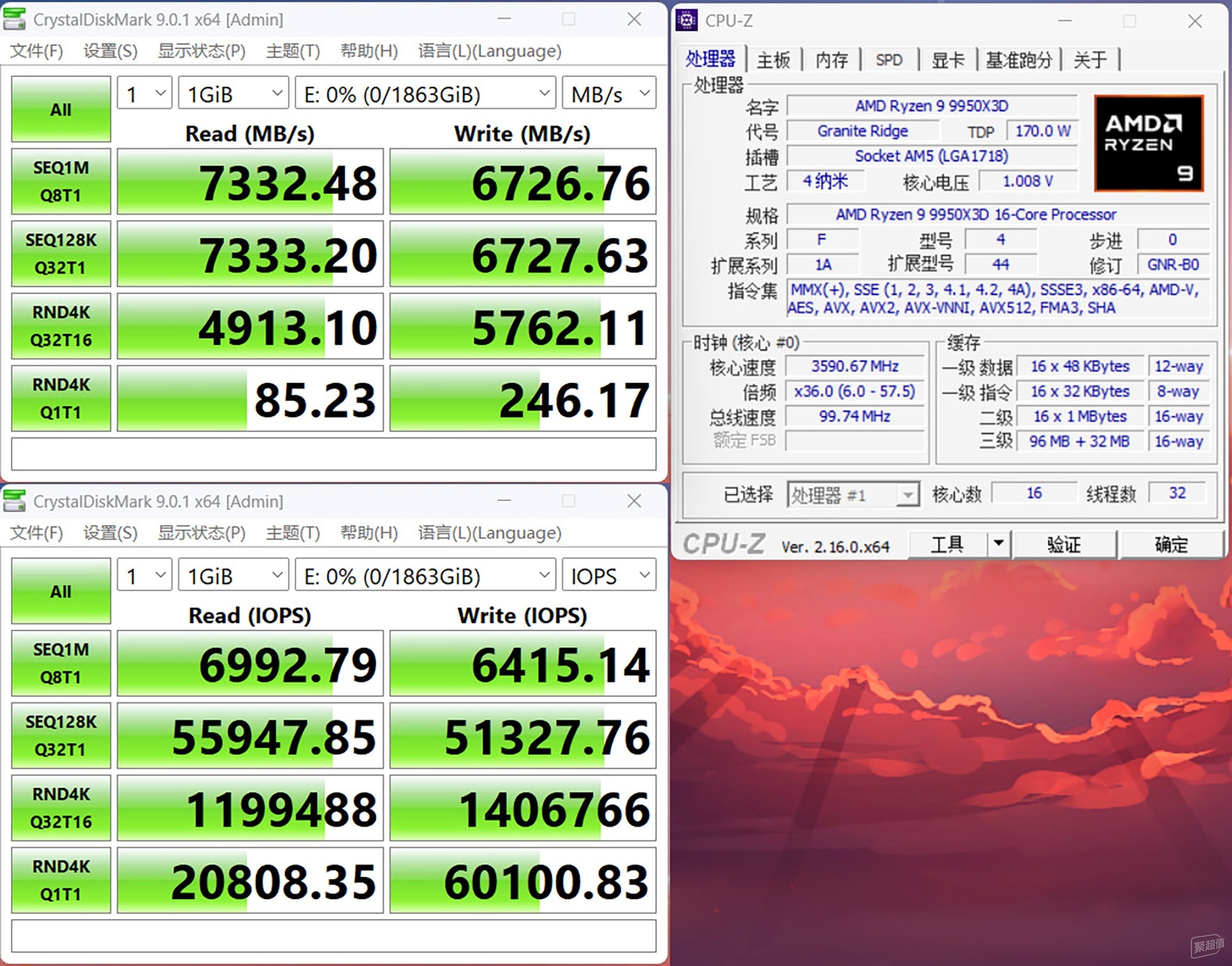 在AMD锐龙9 9950X3D处理器+B850M主板上进行性能测试,实测闪迪WD Blue SN5100固态硬盘的顺序读取速度为7332MB/s,顺序写入速度为6726MB/s,4K单线程读写速度为85.23MB/s与246MB/s,固态硬盘在Intel/AMD两个平台中均达到所标称的顺序读写速度。