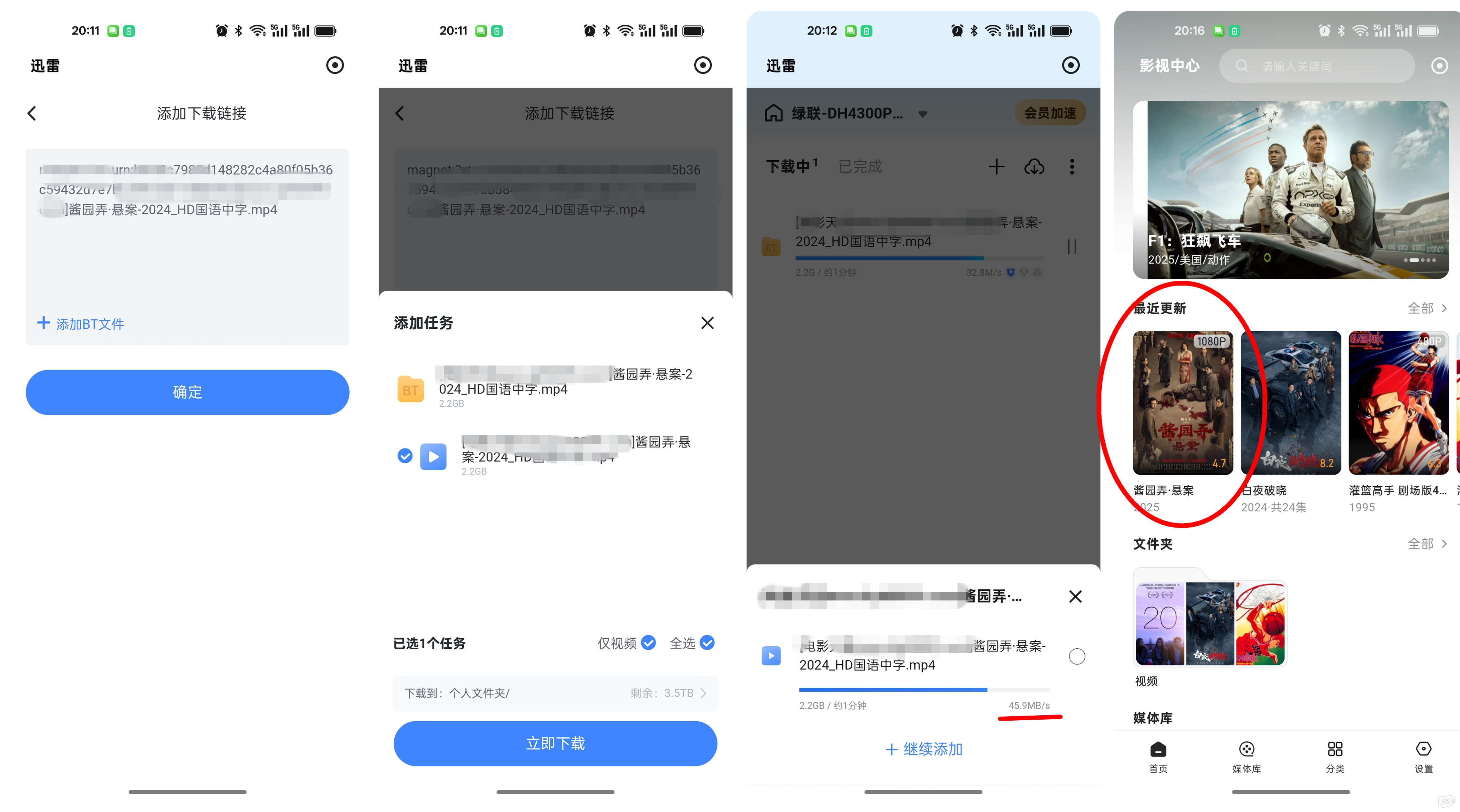 有了绿联DH4300 Plus,以前在手机上很难操作的迅雷下载,也变得非常简单。只要在绿联APP上打开迅雷,粘贴链接,绿联DH4300 Plus就会替我们下载好,然后在影视中心里更新,方便我们观看。而且速度还是超快的,我用的时候能实现45MB/s的下载速度,不到五分钟一部高清电影就下载好了。