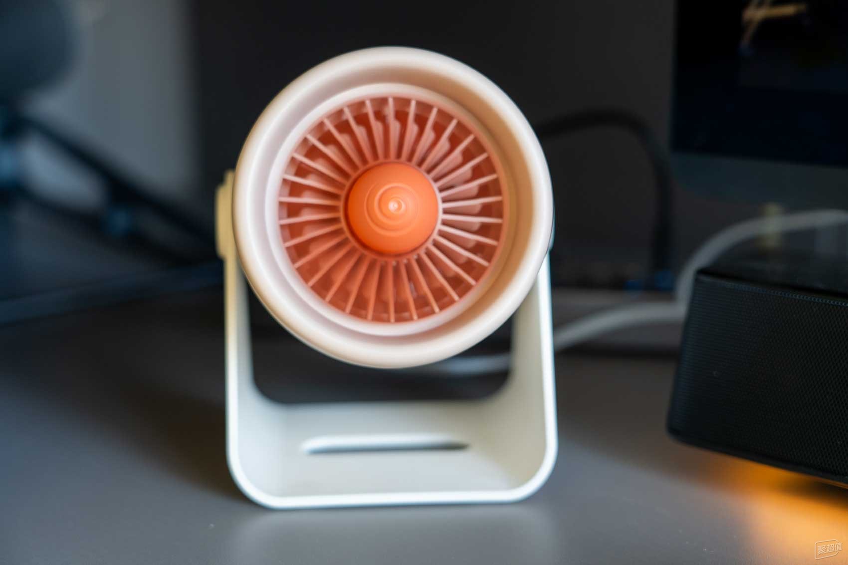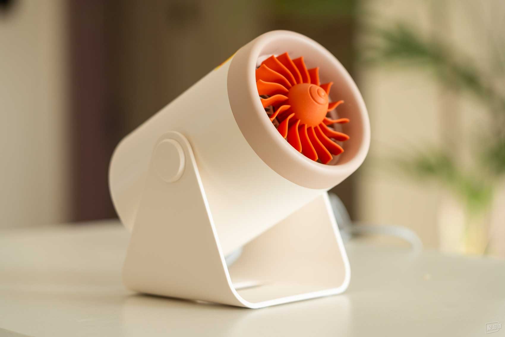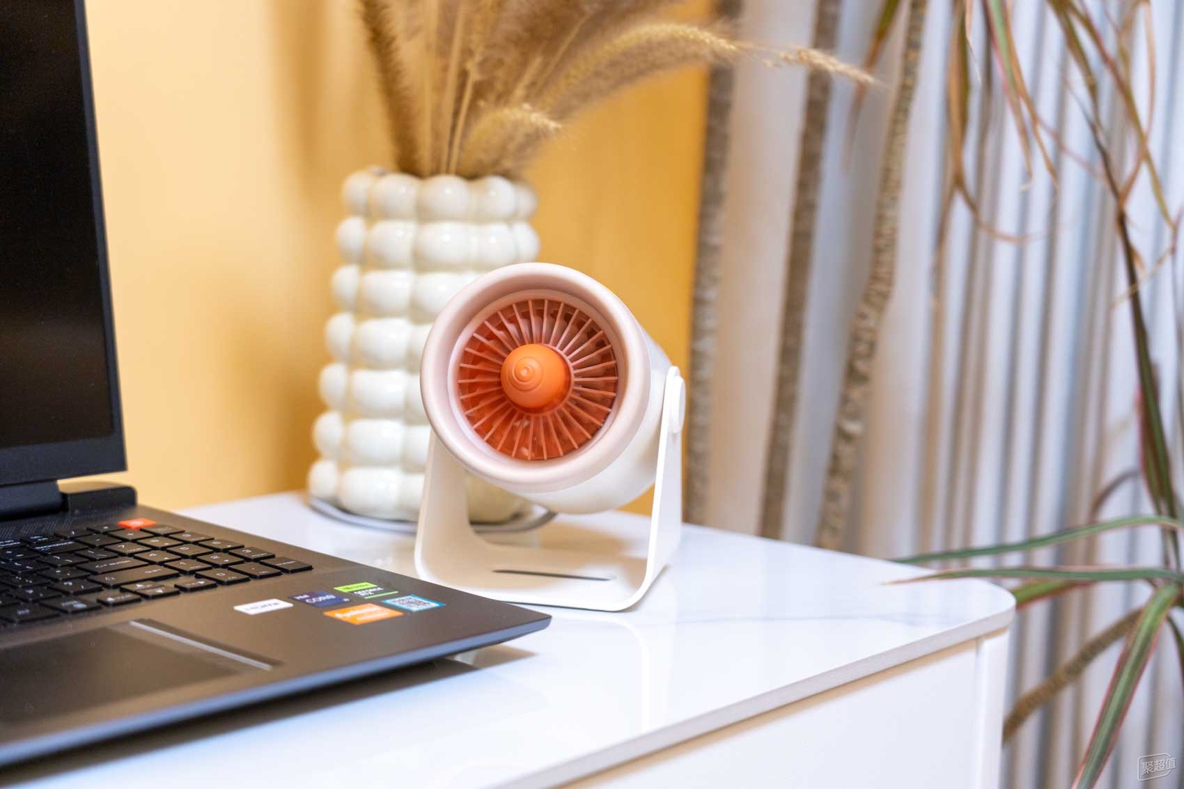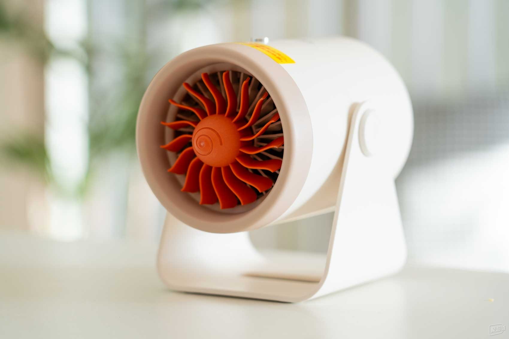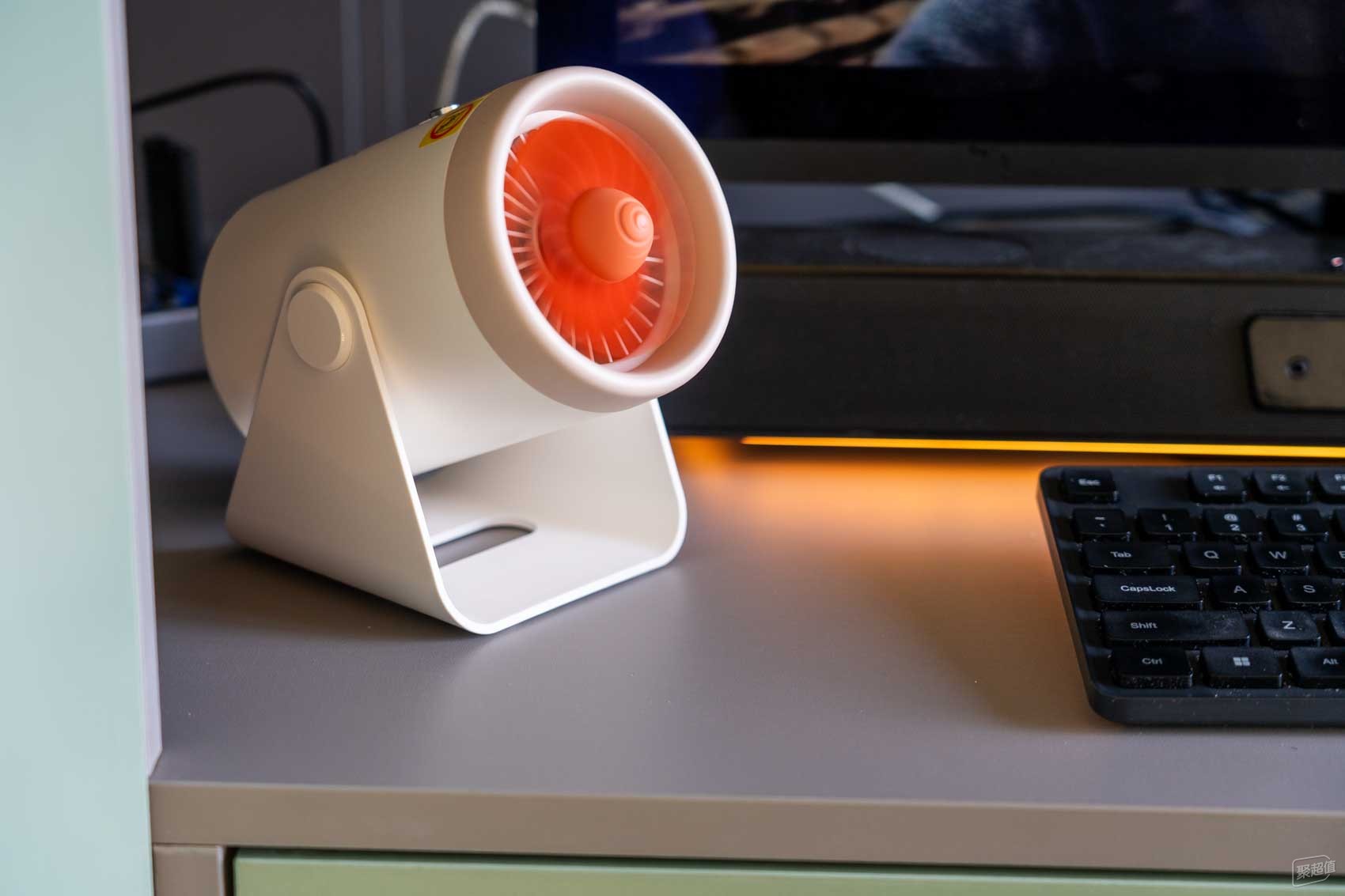 它的尺寸小到我一只手可以抓起来,红红的叶片像飞机的涡扇叶片一样,富有科技美感。一个便携式的底座可以很方便的摆放,并且带有角度可以调角,支持90°仰俯自由调节,我可以根据桌面、卧室或办公场景灵活调节风向,实现立体均匀送暖。这一贴心设计让温暖能够精准覆盖每一个使用角落,带来更舒适、更智能的取暖体验。无论是需要暖脚、暖手还是暖身,都能找到最合适的角度。
